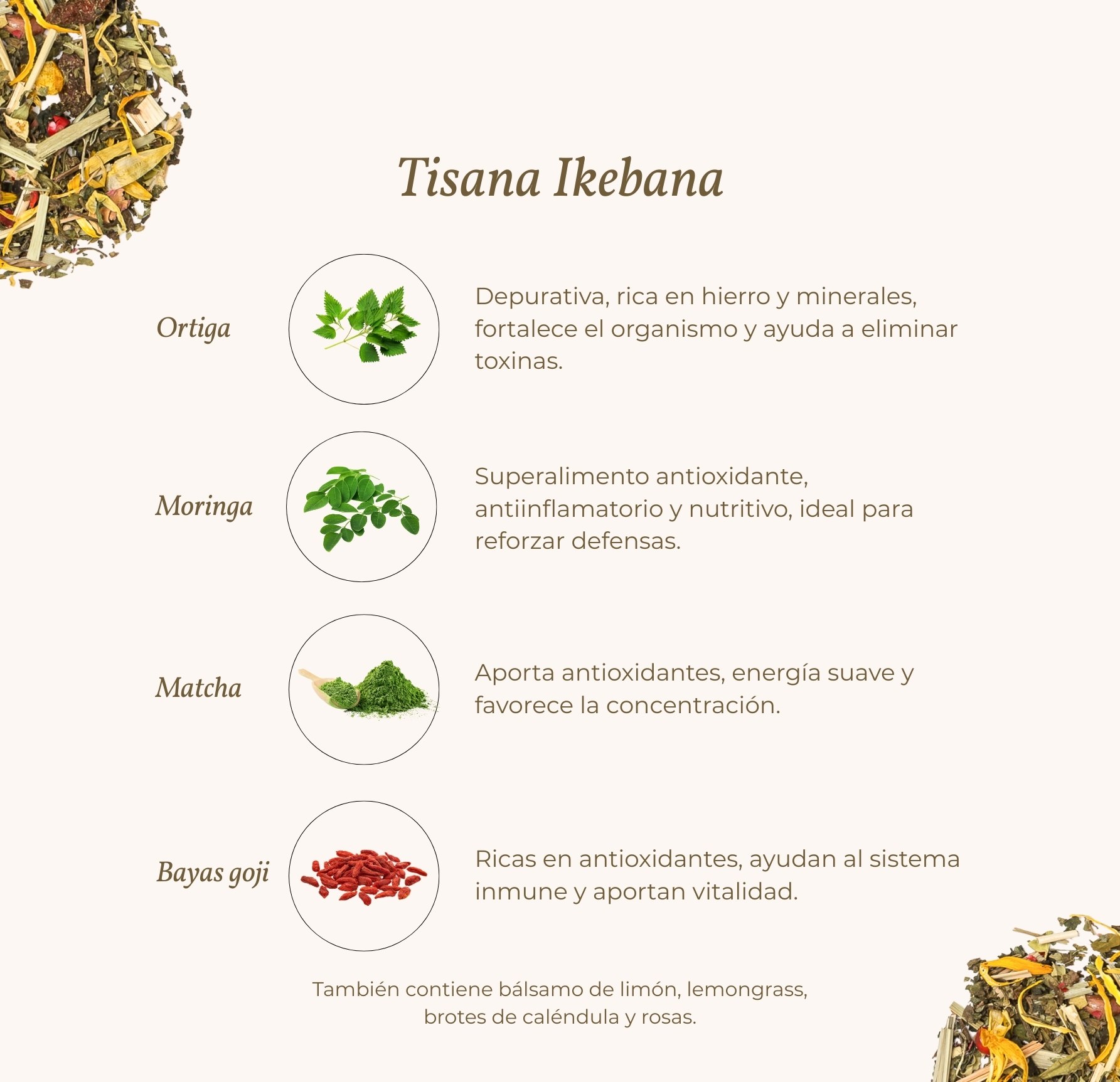 Infusión de hojas de ortiga, bálsamo de limón, lemongrass, hojas de moringa, brotes de caléndula y rosas, bayas goji y té verde Matcha japonés. Tisana refrescante y herbal. Como no contiene teína, estimula es ideal para beber después de la cena y lograr un buen descanso. Clásica infusión de hierbas para sentirte bien. Apta para embarazadas. Incluye cuchara infusora.